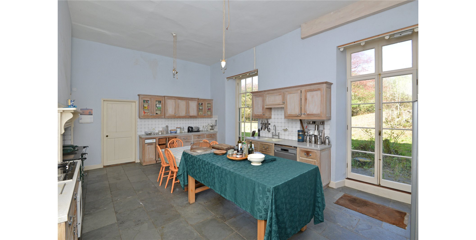 Kitchen/Breakfast Room - Floor to ceiling window to the rear elevation overlooking the gardens, with French doors giving access onto the garden. Extensive range of matching wall and base units, with sink set into roll top work surfaces and a triple Aga set in a chimney recess. Integrated electric and gas hob and space for a fridge/freezer, dishwasher and microwave. The original servant bells remain, but are not operational. Access to walk-in pantry and large (Victorian) wine cellar.
